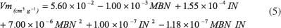 為了描述亞甲基藍(lán)和碘的數(shù)量相對(duì)于表面積的行為,使用二次模型。對(duì)于模型開(kāi)發(fā),Kennard-Stone算法從105個(gè)樣本中選擇了27個(gè)樣本并用于校準(zhǔn)。樣品表面積從199到2105 m 2 g -1不等。亞甲基藍(lán)的數(shù)量在0到501毫克克每升之間,碘值從155到1670毫克克每升。建模后獲得的表面擬合(圖1)由公式4描述。