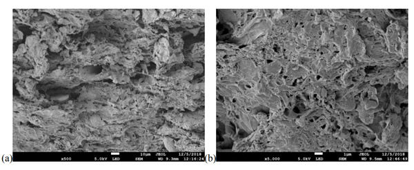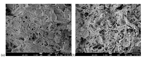 根據(jù)觀察到的活性炭微觀結(jié)構(gòu)來(lái)進(jìn)行形態(tài)研究。圖1顯示了在650°C(a)和850°C(b)兩種不同溫度下用25%H3PO4制成的活性炭的比較?梢钥闯,與650℃相比,在850℃下制備的活性炭具有稍大的孔?梢缘弥左w積隨著活化溫度的升高而逐漸增加。