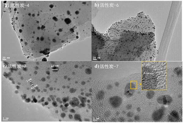 為了進(jìn)一步研究金顆粒在活性炭表面的分布和結(jié)晶度,我們拍攝了鍍金活性炭樣品的透射電子顯微鏡圖像。圖7顯示了各種活性炭樣品在不同放大倍數(shù)下的TEM圖像。圖2a、b顯示了金納米粒子在活性炭表面上的分布。很明顯,兩個(gè)樣本的分布是均勻的。活性炭-4和活性炭-6似乎都以類似的方式相互作用和承載金納米粒子。活性炭-7樣品的高分辨率TEM圖像如圖2c、d所示。圖2c顯示大多數(shù)金納米顆粒很小,直徑為3-5nm,并且只能看到少數(shù)團(tuán)聚顆粒。圖2d顯示了金的晶格條紋間距。發(fā)現(xiàn)晶格條紋間距為0.217nm,對(duì)應(yīng)于金晶面的面。此外,我們?cè)噲D通過TEM圖像估計(jì)顆粒尺寸的分布,我們發(fā)現(xiàn)所有樣品中超過80%的金顆粒的尺寸小于5nm。