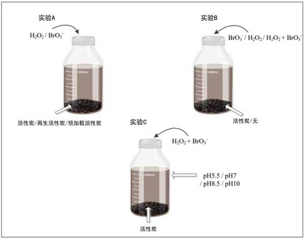在對50家飲用水公用設(shè)施進(jìn)行的調(diào)查中,獲得過氧化氫和溴化物的平均值來當(dāng)做測試用水。在所有實驗中,批量反應(yīng)器都用薄箔包裹。制備0.052µmol/L溴酸鈉溶液并加入間歇反應(yīng)器中以獲得0.5µmol/L溴酸鹽的濃度。高級氧化工藝中的出水殘留過氧化氫濃度不會超過180µmol/L。因此,在本研究中,將150µmol/過氧化氫加入到間歇式反應(yīng)器中。如圖1所示,在23–27℃的環(huán)境溫度下,使用36個批次玻璃瓶進(jìn)行了一系列實驗。活性炭用量始終為5g/L,過氧化氫和溴酸鹽濃度始終分別為150µmol/L和0.5µmol/L。所有裝有過氧化氫的間歇式反應(yīng)器都用鋁箔覆蓋,以防止過氧化氫被光潛在降解。在如圖1所示的實驗中,使用16個間歇式反應(yīng)器和三種不同的活性炭(活性炭、再生活性炭和預(yù)加載活性炭)來研究不同運行時間的活性炭對溴酸鹽和過氧化氫的去除,該實驗涉及八個處理組。