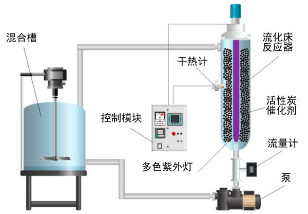 圖1:中試規(guī)模的流化床光反應器示意圖,用于從工業(yè)廢水中去除苯胺和苯并噻唑的光催化和吸附實驗。