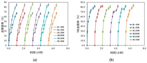 圖4:使用活性炭催化劑在六個重復循環(huán)內對苯胺和苯并噻唑進行光催化降解的可重復使用性測試。(a)苯胺和苯并噻唑的初級降解(b)礦化。