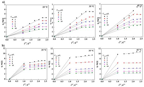 外部和粒子內(nèi)傳質(zhì)過程的分析可以對3,5-二硝基水楊酸的吸附產(chǎn)生顯著影響,在去除3,5-二硝基水楊酸時可能存在由于物質(zhì)傳輸造成的限制,這有必要對這種現(xiàn)象進(jìn)行分析。圖2a是以外擴(kuò)散模型為基礎(chǔ)構(gòu)建的,從中可以看出,對于活性炭,在吸附過程中接觸長達(dá)6小時的實驗點處存在一條直線,這表明存在以下可能性,在任何溫度的過程中通過外部傳質(zhì)控制。圖2b顯示了粉末活性炭在3,5-二硝基水楊酸吸附中獲得的實驗數(shù)據(jù)的表示,其中在與吸附劑接觸1小時時觀察到一條直線。這表明使用活性炭粒子不存在外部傳質(zhì)問題,因為3,5-二硝基水楊酸會迅速從溶液中去除,擴(kuò)散到表面。此外,這表明活性炭顆粒中的吸附過程可能是由于表面存在的官能團(tuán)。根據(jù)這些結(jié)果,確定是否也存在內(nèi)部傳質(zhì)問題很重要,從而能夠確定3,5-二硝基水楊酸刪除過程是否受到這種現(xiàn)象的存在的顯著影響。
