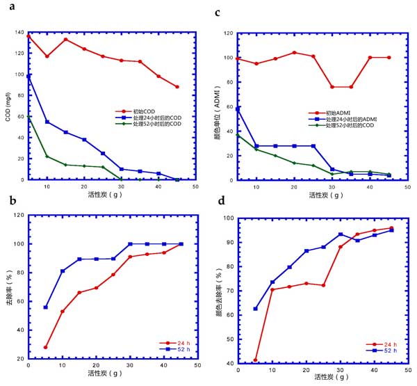 不同活性炭用量在24和54小時(shí)后COD和ADMI的變化如圖2所示。在初始COD濃度為88-136mg/L的情況下,分別通過吸附染料廢水24和52小時(shí)來完全去除COD需要45和30g的活性炭用量(圖2ab)。ADMI的降低和去除趨勢隨活性炭用量24和52小時(shí)的變化與COD變化相似(圖2)。ADMI隨著活性炭用量的增加而降低;钚蕴课24小時(shí)和52小時(shí)后,殘留ADMI分別為4-5和5-7。隨著活性炭用量≥30g,ADMI的去除效率從88-96%提高到90-95%。