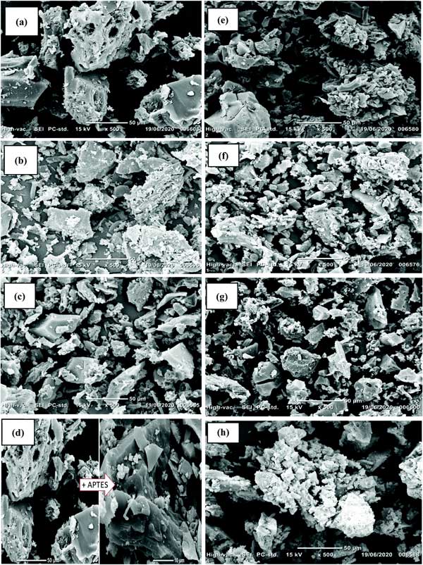 材料的SEM圖像在圖1中給出。活性炭具有不均勻的光滑表面,粒徑約為50μm(圖1a)。在用硝酸和過氧化氫進(jìn)行氧化處理后,氧物質(zhì)(羧基和硝酸鹽基團(tuán))被接枝,導(dǎo)致活性炭-OH的表面比活性炭更粗糙(圖1e)。通過APTES處理接枝氨基硅烷是成功的:活性炭-APTES和活性炭-OH-APTES表面分別比活性炭和活性炭-OH更光滑(圖1d和f)。裂縫和不均勻的空腔可用作氟化物的吸附位點(diǎn)。存在的粗糙表面和大量白色顆粒證實(shí)了Al顆粒的添加(圖2c、g和h)。這些白色顆粒可以對(duì)應(yīng)于結(jié)合到材料表面的不同形狀和尺寸的Al納米顆粒的不同簇。