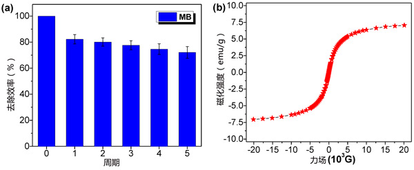 首先,研究了活性炭含量對磁性吸附劑吸附能力的影響。為了比較,活性炭的吸附容量也在相同條件下確定。在較高的初始染料濃度(5.0mM)下,磁性活性炭對MB和MO的飽和吸附能力明顯增加,隨著活性炭含量的增加。但是對于實際的吸附應用,非常需要具有良好可重復使用性的吸附劑。我們通過使用乙醇作為洗脫劑來評估吸附MB的磁性活性炭的可重復使用性。如圖3a所示,解吸的磁性活性炭的去除效率隨著重復使用次數(shù)的增加而降低。與原來的去除效率相比,經(jīng)過5個解吸-吸附循環(huán)后,去除效率保持在72.1%左右。盡管如此,再生的活性炭的吸附能力仍然比較高,高于傳統(tǒng)的磁性吸附劑。此外,即使經(jīng)過5次再生吸附循環(huán)后,磁性活性炭仍表現(xiàn)出與新制備的相似的飽和磁化強度值(圖3b),表明這次的新型吸附劑具有良好的結(jié)構(gòu)穩(wěn)定性。
