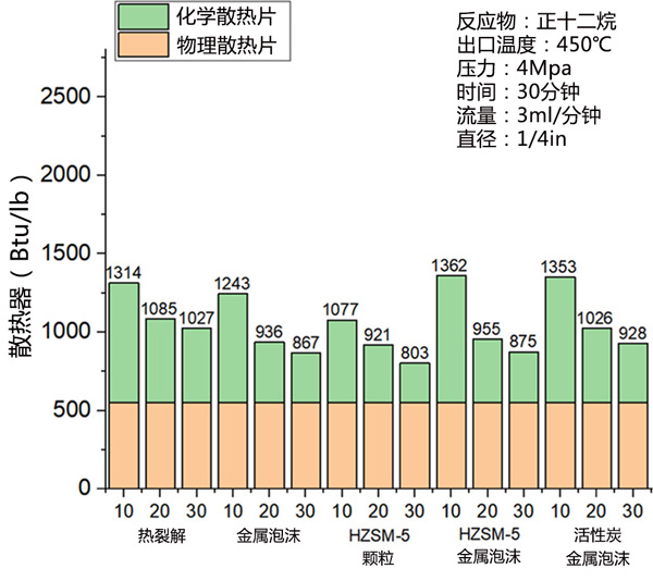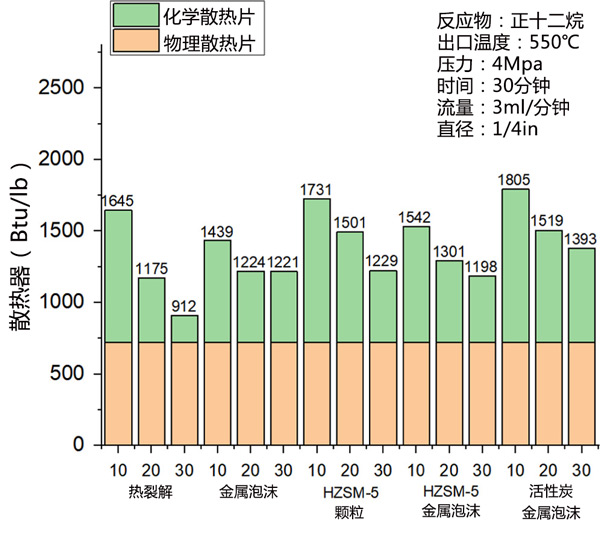 熱裂解和催化裂解產(chǎn)生的散熱片-十二烷在圖2顯示,溫度為450℃,壓力為4MPa。由于散熱器與使用的飛機(jī)冷卻技術(shù)直接相關(guān),因此應(yīng)慎重考慮。測(cè)量的散熱器值在10分鐘內(nèi)取平均值,通過將它們除以質(zhì)量流量將瓦特轉(zhuǎn)換為Btu/lb單位。反應(yīng)10分鐘后,HZSM-5/金屬泡沫和活性炭/金屬泡沫樣品的散熱片分別為1342和1353Btu/lb。兩種催化劑在10分鐘內(nèi)都表現(xiàn)出高散熱片。僅金屬泡沫和HZSM-5顆粒的初始散熱器分別為1243和1077Btu/lb。僅涉及金屬泡沫的反應(yīng)的熱沉低于熱裂解的熱沉。由于反應(yīng)溫度低,泡沫不作為金屬催化劑并占據(jù)反應(yīng)空間30分鐘。HZSM-5顆粒在反應(yīng)的前30分鐘內(nèi)導(dǎo)致最低的熱沉,因?yàn)闅怏w產(chǎn)率低且產(chǎn)生大量線性石蠟。相比之下,熱裂化的散熱器保持在高值30分鐘。因此,在低反應(yīng)溫度下,酸和金屬催化劑均表現(xiàn)出低催化效率并占據(jù)反應(yīng)空間。