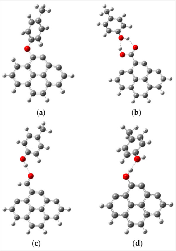 預計甲酚在活性炭上的吸附將通過各種類型的相互作用進行,例如電子供體-受體機制、靜電相互作用、π-π相互作用和氫鍵形成。然而,在各種類型的相互作用中,活性炭和被吸附物之間的氫鍵是有助于吸附過程的重要相互作用類型之一。因此,在本研究中,使用DFT方法研究了對甲酚和活性炭之間的氫鍵相互作用。考慮到它們之間的氫鍵,研究了對甲酚與原始活性炭和功能化活性炭的相互作用。圖1代表各種相互作用的優(yōu)化結構。