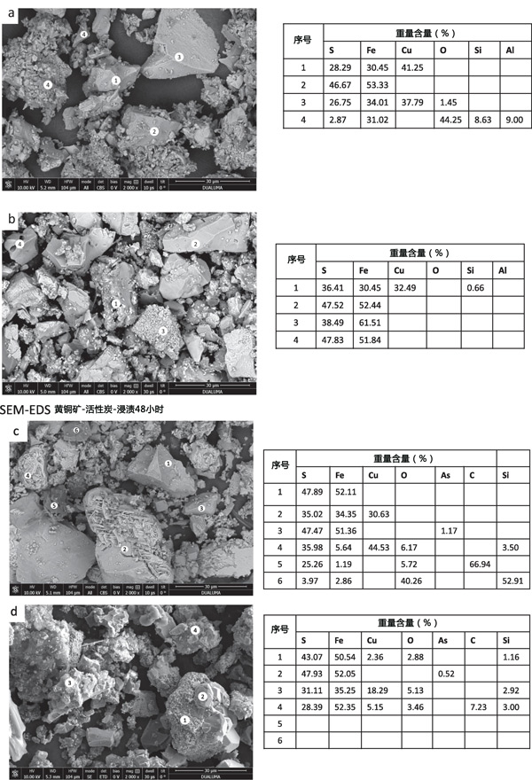 在浸出殘?jiān)邪l(fā)現(xiàn)的其他礦物種類(lèi)是黃銅礦、黃鐵礦、閃鋅礦和石英。氧化還原電位必須足夠低才能形成Cu2S,而黃鉀鐵礬沉淀在非常高的氧化還原電位下更受青睞。通過(guò)SEM-EDS對(duì)初始活性炭樣品(圖3a)和浸出殘留物(圖3b和3c)的分析表明存在黃銅礦、黃鐵礦和初始精礦中的小石英顆粒。浸出48小時(shí)后(圖3b),固體殘留物顯示存在黃銅礦,表面因浸出而改變黃鐵礦。對(duì)活性炭浸出48小時(shí)后獲得的殘留物的分析表明存在黃鐵礦、吸附硫的碳,并且一些黃銅礦顆粒發(fā)生了很大的變化,表明從黃銅礦中優(yōu)先浸出Fe而不是Cu。