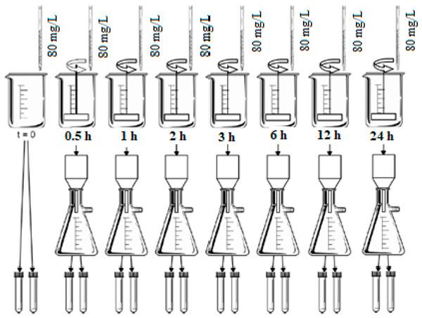 測定平衡時間的吸附試驗對每種活性炭進行兩次。使用了7個裝有500mL研究水的1L燒杯。每個燒杯接受一份活性炭懸浮液,以在水研究中獲得80mg/L的初始濃度。將燒杯放在一個罐子測試設(shè)備中,將混合速度保持在205rpm在恒溫23℃的環(huán)境中。采用的接觸時間為0.5、1、2、3、6、12和24小時。接觸時間后,將每個燒杯從攪拌中取出,立即通過孔徑為0.22μm的纖維素酯膜過濾研究水,以分離碳并中斷吸附過程。分析過濾后的水餾分的pH值和柱狀藻紅濃度。圖1顯示了平衡時間測定分析中評估的條件的示意圖。