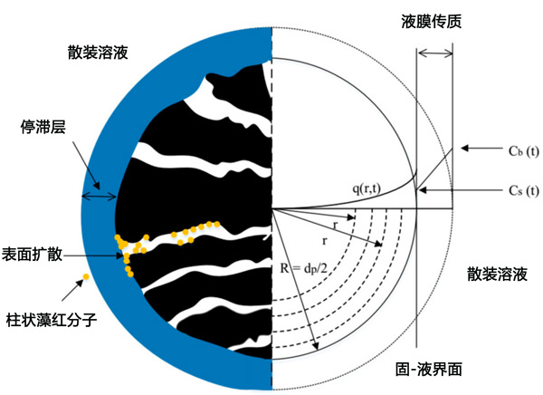 在第一實驗階段獲得的吸附平衡測試的實驗數(shù)據(jù)適合等溫線模型Langmuir、Freundlich和Redlich-Peterson。將最適合吸附平衡數(shù)據(jù)的等溫線模型的參數(shù)值應(yīng)用于HSDM模型,以模擬SBA柱中的吸附過程。該模型考慮了發(fā)生在兩個連續(xù)擴散步驟中的吸附過程,即:通過活性炭顆粒周圍的固定流體層擴散(膜擴散)和通過活性炭內(nèi)部孔的擴散(表面擴散),如圖2所示。