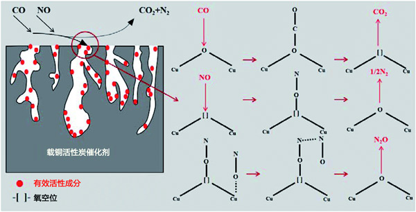 在活性炭催化劑表面通過(guò)選擇性催化還原技術(shù)(CO-SCR)反應(yīng)進(jìn)行的低溫脫硝是一種具有代表性的非均相催化體系,遵循Langmuir-Hinshelwood反應(yīng)機(jī)理。因此,提出了圖3所示的脫硝機(jī)制,用于在活性炭催化劑上對(duì)NO進(jìn)行CO還原。活性組分Cu均勻分散在活性炭上,增加了催化劑的比表面積和對(duì)NO和CO的吸附。這一結(jié)論表明Cu均勻分布在活性炭催化劑的表面,將脫硝效率提高到80%。CO吸附在催化劑表面以還原-O-Cu2+到=Cu+并生成CO2。吸附的NO解離成N和O,解離的N原子與NO分子結(jié)合形成N2O。據(jù)報(bào)道,NO的解離是CO誘導(dǎo)的NO消除的關(guān)鍵步驟;钚晕稽c(diǎn)的釋放促進(jìn)了CO的吸附,最后N2O和=Cu+反應(yīng)生成N2和–O–Cu2+,這進(jìn)一步促進(jìn)了脫硝反應(yīng)。在CO與NO的反應(yīng)中,Cu2+↔Cu+交換可能會(huì)改變催化劑表面的價(jià)態(tài),更多的氧空位可用于轉(zhuǎn)化過(guò)程,促進(jìn)NO向N2的轉(zhuǎn)化。