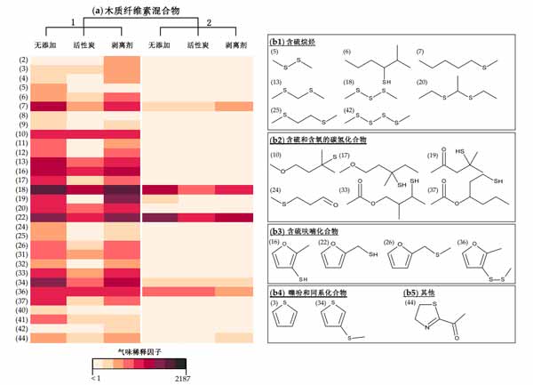 圖2:(a)在未處理和處理過(guò)的兩種木質(zhì)素混合物中檢測(cè)到的含硫氣味劑氣味稀釋因子的彩色差異和(b1-b5)硫氣味劑的結(jié)構(gòu)式根據(jù)其化學(xué)結(jié)構(gòu)分為亞組數(shù)字(2-44)是指氣味的連續(xù)順序。