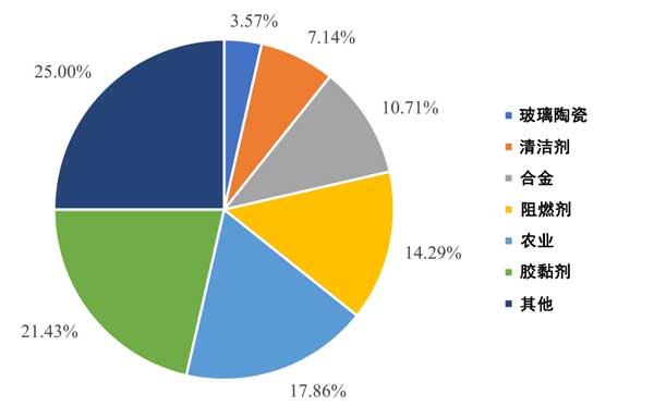 硼是自然界七大必需微量元素之一,少量的硼攝入有利于植物細(xì)胞膜保持其結(jié)構(gòu)和功能的完整性,并維持正常的發(fā)育和物質(zhì)運(yùn)輸。硼不僅是生物體必需的微量元素,也是許多工業(yè)的重要原料,如制造業(yè)和農(nóng)業(yè)。根據(jù)近期的統(tǒng)計(jì)數(shù)據(jù),僅硼酸鹽就有300多種應(yīng)用,全球四分之三以上的硼消耗量來(lái)自陶瓷、洗滌劑、化肥和玻璃(圖2)。在生產(chǎn)過(guò)程中,硼酸鹽是制造各種特殊玻璃和陶瓷的主要成分。在高級(jí)玻璃和玻璃纖維的生產(chǎn)中使用硼硅酸鹽可以提高玻璃的耐熱性和透明度,有利于提高其化學(xué)穩(wěn)定性以及抗機(jī)械和熱沖擊的能力。在瓷釉中加入硼可以防止脫釉和開裂,提高產(chǎn)品的光澤度和耐久性。在瓷體中加入硼酸鹽有利于降低能耗,提高產(chǎn)品的機(jī)械強(qiáng)度。硼還用于生產(chǎn)微合金鍛鋼并提高鋼的沖擊強(qiáng)度。在農(nóng)業(yè)領(lǐng)域,硼被用于生產(chǎn)含硼化肥等產(chǎn)品。但是灌溉水中的硼含量升高會(huì)直接導(dǎo)致動(dòng)植物中毒造成危害,所以一定要控制排放。