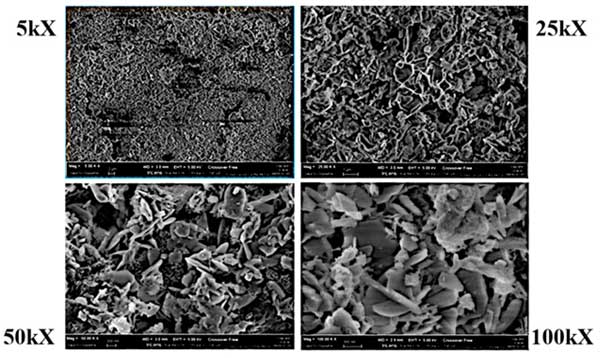 采用掃描電子顯微鏡(SEM)結(jié)合EDS分析來表征吸附劑樣品。局部化學(xué)分析通過EDS(能量色散X射線光譜法)實現(xiàn)。定性分析是通過識別光譜中報告的線來實現(xiàn)的,而定量分析(確定元素組成百分比)是通過測量樣品中存在的每種元素的線強度來進行的。圖1顯示了一系列活性炭的SEM圖像,放大倍數(shù)遞增:5000、25,000、50,000、100,000倍。SEM圖像說明了活性炭的多孔結(jié)構(gòu),突出了樣品表面不連續(xù)性的存在。高孔隙率的存在對于限制鼓風(fēng)機系統(tǒng)過濾沼氣的能量損失是必要的。正如我們之前的一些研究報道的那樣,SEM圖像與EDS分析相結(jié)合可用于突出硫在孔隙和金屬基催化位點內(nèi)的吸附和保留。