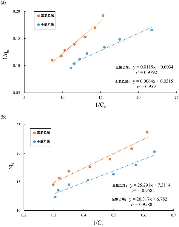 圖2:(a)活性炭和(b)硅膠吸附氯代有機(jī)化合物的實(shí)驗(yàn)數(shù)據(jù),符合Langmuir等溫線(xiàn)的線(xiàn)性形式。