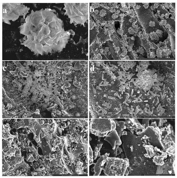 改性活性炭和活性炭樣品的微觀結構通過SEM表征。如圖2所示,改性活性炭樣品在活性炭表面生長有花狀Bi2O2CO3,大小約為。5μm(圖2a、b)。這些結果表明Bi2O2CO3通過原位結晶過程在活性炭表面成功生長;钚蕴烤哂袌A柱狀形態(tài),長度為數百納米(圖2c、d)。圖2e、f顯示了原始活性炭樣品的形態(tài),它具有多孔結構、高比表面積和良好的吸附能力。