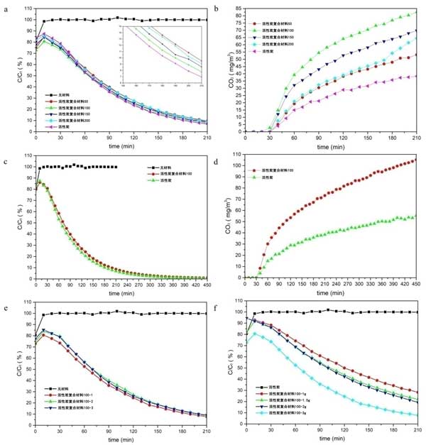 在光照下研究了活性炭復合材料在空氣中降解氣態(tài)甲苯(50.0ppm)的光催化性能。如圖3a所示,所有樣品均表現出超過90%的良好去除效率。在活性炭復合材料中,100g添加量的活性炭顯示出最佳效率,3小時內去除率高達92.2%。如果用以前的方法從空氣中去除甲苯,例如生物過濾、后等離子體催化技術和電極放電。與那些通常昂貴且復雜的方法相比,目前的活性炭復合物具有綠色和低成本的優(yōu)點。使用氣相色譜儀檢測甲苯降解產物。結果表明,CO2是活性炭復合材料的主要產物(圖3b),3小時內最高產率為82.5mg/m3,另一個主要產物應該是H2O,甲苯是碳氫化合物的基礎上。我們在介紹中提到的,活性炭主要充當吸附劑還可以作為光催化劑來降解有機污染物。然而,它僅在紫外光照射下有活性,催化效率低。這些結果清楚地表明,在活性炭表面原位生長Bi2O2CO3后,甲苯的降解率提高了。這歸因于活性炭的吸附能力和Bi2O2CO3和活性炭的光催化活性的協同效應,證明了復合材料的優(yōu)勢。