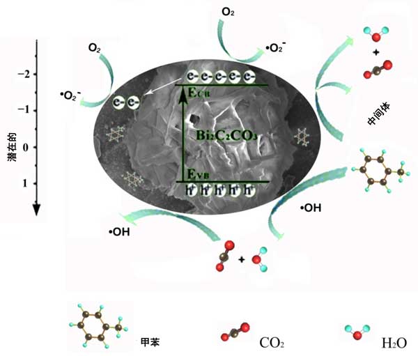 活性炭復合材料在光照射下降解氣態(tài)甲苯的光催化反應機制可以解釋如下(圖4)。首先,蜂窩狀活性炭基質吸附并捕獲甲苯分子。然后,在光照下,電子從價帶(VB)激發(fā)到負載Bi2O2CO3的活性炭表面的導帶(CB),在VB中留下空穴。活性炭可以充當電子受體以降低電子-空穴對的復合率。因此,Bi2O2CO3中CB上的激發(fā)電子可以很容易地轉移到活性炭表面,從而促進光生電荷載流子的分離和遷移。