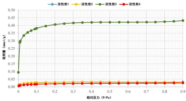 活性炭的吸附等溫線已使用氮(N2)吸附分析技術(shù)(一種標(biāo)準(zhǔn)方法)進(jìn)行了研究。圖2顯示了活性炭在77K時的N2吸附等溫線,該等溫線被發(fā)現(xiàn)為I型等溫線。N2吸附在低相對壓力范圍內(nèi)的快速上升證實了所有樣品都存在小孢子,如圖2所示。很明顯,活性炭4具有最低的N2吸附,而活性炭1和活性炭2的吸附等溫線重疊,活性炭3具有最高的N2吸附。數(shù)據(jù)的這種可變性可能歸因于所使用的不同前體材料。此外,除活性炭3外,活性炭的大部分孔隙體積都填充在P/Po≈0.1以下。對于活性炭3,孔體積填充低于P/Po≈0.3。在初始增加到0.1后,等溫線逐漸彎曲,表明進(jìn)一步吸附的增量較小。隨著相對壓力的增加,所有樣品的吸附幾乎呈水平狀態(tài),表明已經(jīng)達(dá)到飽和。