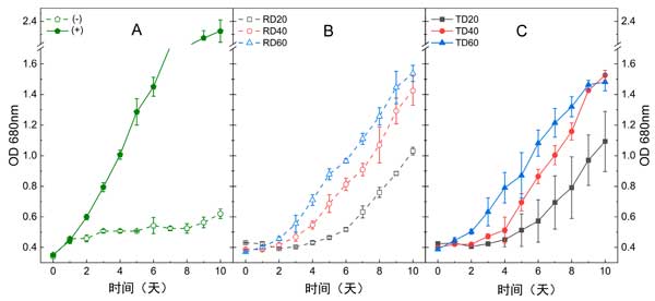 厭氧消化物中存在的大量和微量營養(yǎng)素的多樣性可能有利于藍(lán)藻代謝。即使活性炭預(yù)處理顯著降低了幾個參數(shù),包括COD、濁度和苯酚含量,原料(4405mg/L)和預(yù)處理消化物(4220mg/L)的銨濃度仍然高于藍(lán)藻螺旋藻支持的閾值濃度(100–150毫克/升)。在這種情況下,使用以三種不同稀釋率稀釋的原始和預(yù)處理消化物進(jìn)行了一系列藍(lán)藻毒性測定:20×、40×和60×。未稀釋的消化物,無論是否用活性炭處理,都沒有在本實(shí)驗(yàn)中進(jìn)行測試,因?yàn)槌醪脚囵B(yǎng)分析表明它們對培養(yǎng)物毒性太大(數(shù)據(jù)未顯示)。因此,該實(shí)驗(yàn)的目的是比較以不同稀釋率稀釋的兩種消化物以及兩個對照組之間的生長性能。連續(xù)測量680nm處的OD超過10天,以評估所有條件下的生長情況。在三種不同稀釋因子下測試的原始消化物(RD)和處理過的消化物(TD)條件下,觀察到類似生長趨勢(圖2A、B)。當(dāng)增加原始和預(yù)處理消化物的培養(yǎng)基稀釋倍數(shù)時,會產(chǎn)生更高的生長反應(yīng)。同樣,滯后期受原始消化物和預(yù)處理消化物的稀釋因子的影響,觀察到的滯后期越長,消化物越濃縮。例如,稀釋20倍和40倍的未處理消化物的滯后期分別持續(xù)4天和2天。在本研究中,根據(jù)稀釋倍數(shù)和預(yù)處理?xiàng)l件,使用221和71mg/L之間的初始銨氮(NH4+-N)濃度,鈍頂藻能夠增殖。一般而言,原始消化物和預(yù)處理消化物的更高稀釋度產(chǎn)生更高的生長。