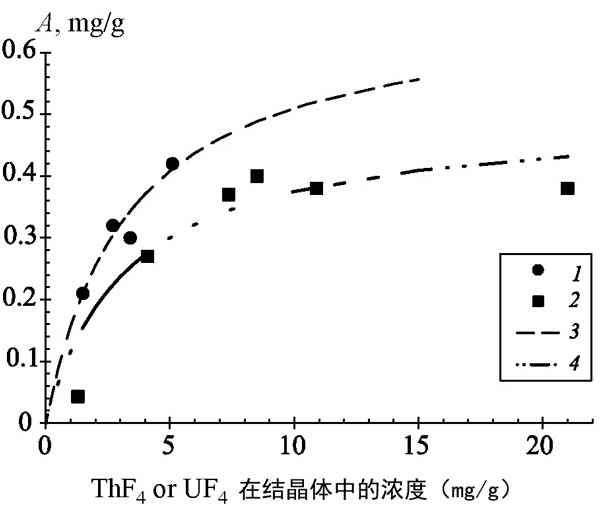 圖2:從熔體中吸附釷和鈾氟化物的等溫線。(1,2)實驗數(shù)據;(3,4)根據Langmuir方程逼近實驗點。(1,3)四氟化鈾;(2,4)THF4。