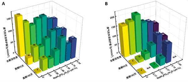 用磷酸三鈉12水合物(Na3PO4·12H2O)在活性炭上進(jìn)行類似的實(shí)驗(yàn),活性炭失活后干燥。實(shí)驗(yàn)在11.03wt.%的濃度下進(jìn)行,相當(dāng)于4.00wt.%的NaH2PO4·H2O的摩爾當(dāng)量。很明顯,磷酸三鈉在抑制衰老方面并不有效。經(jīng)過(guò)3個(gè)月的加速失活,保護(hù)值甚至低于未改性的活性炭。然而,Na3PO4·12H2的效率可能會(huì)降低如果在酸性環(huán)境中或與酸或酸性化合物一起添加,效果會(huì)更好。這是因?yàn)樗嵝詶l件可以向磷酸鹽提供質(zhì)子,導(dǎo)致磷酸鈉有效地充當(dāng)Na2HPO4或NaH2PO4?傮w而言,結(jié)果表明,在由磷酸及其三種鈉鹽組成的磷酸鹽添加劑中,一元鹽NaH2PO4·H2O是抑制失活最有效的添加劑。