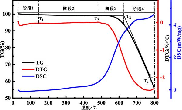第一階段是水蒸發(fā)和解吸階段,從開始到T1。此階段活性炭樣品和吸熱DSC的質(zhì)量損失主要是由于表面和孔隙內(nèi)部的水蒸發(fā)以及氣體解吸造成的。