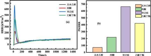 圖4b顯示了四個樣品的最大放熱率(PkHRR),其順序為環(huán)己烷(663.41kW/m2)>乙酸丁酯(421.4kW/m2)>丙酮(219.49kW/m2)>純無水乙醇(71.4kW/m2)。觀察到3個VOCs吸附樣品的PkHRR遠高于ROW,其中環(huán)己烷樣品的Pk放熱率最高,表明CYH樣品的燃燒危害最嚴重。