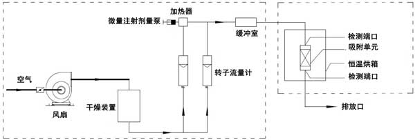 動(dòng)態(tài)吸附實(shí)驗(yàn)在室溫(25℃)下進(jìn)行。實(shí)驗(yàn)裝置由氣體分配系統(tǒng)和吸附系統(tǒng)兩部分組成。吸附系統(tǒng)由恒溫箱和吸附單元組成。檢測口位于吸附系統(tǒng)之前和之后。動(dòng)態(tài)法測定活性炭對(duì)脈沖負(fù)荷緩沖性能的裝置如圖1所示。本實(shí)驗(yàn)以乙醇或二甲苯為單一檢測對(duì)象。氣體分配系統(tǒng)包括風(fēng)扇、干燥裝置、轉(zhuǎn)子流量計(jì)、微注射計(jì)量泵、加熱器和緩沖室。使用FT-IR傅里葉氣體分析儀作為測量設(shè)備。在氣體分配系統(tǒng)中,在短時(shí)間內(nèi)(2分鐘和5分鐘),微注射計(jì)量泵的注射量迅速增加到原始體積的預(yù)定倍數(shù)(10倍和20倍),以產(chǎn)生脈沖負(fù)載。在吸附系統(tǒng)中,吸附單元內(nèi)放置活性炭。吸附單元的直徑為31mm;钚蕴康奶畛涓叨确謩e為2cm、4cm、6cm、8cm。將吸附裝置置于恒溫箱內(nèi)。吸附劑和吸附物的入口空氣保持在室溫。進(jìn)行了吸附劑在室溫下吸附吸附質(zhì)的脈沖加載實(shí)驗(yàn)。潔凈空氣通過干燥裝置后,利用轉(zhuǎn)子流量計(jì)將其按特定比例分成兩個(gè)通道。通過微注射泵將特定濃度的乙醇或二甲苯氣體注射到氣體中。另一種氣體用作稀釋氣體。兩種氣體流入緩沖室,完全混合后進(jìn)入恒溫箱。穩(wěn)定的氣體按照實(shí)驗(yàn)設(shè)定的濃度、流量和溫度進(jìn)入吸附單元。在通過吸附單元之前和之后測量乙醇或二甲苯的濃度。