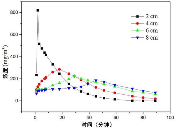當(dāng)平衡吸附濃度為400mg/m3時(shí),不同炭床高度脈沖后釋放的濃度均高于200mg/m3。這表明平衡吸附濃度對(duì)脈沖后釋放濃度有影響。引入脈沖氣體并通過活性炭進(jìn)行緩沖。緩沖液基于吸附平衡活性炭的吸附勢。相同條件下,平衡濃度越大,吸附勢越小,溢流量越大。當(dāng)平衡吸附濃度為400mg/m 3時(shí),脈沖后釋放的濃度高于200mg/m3。