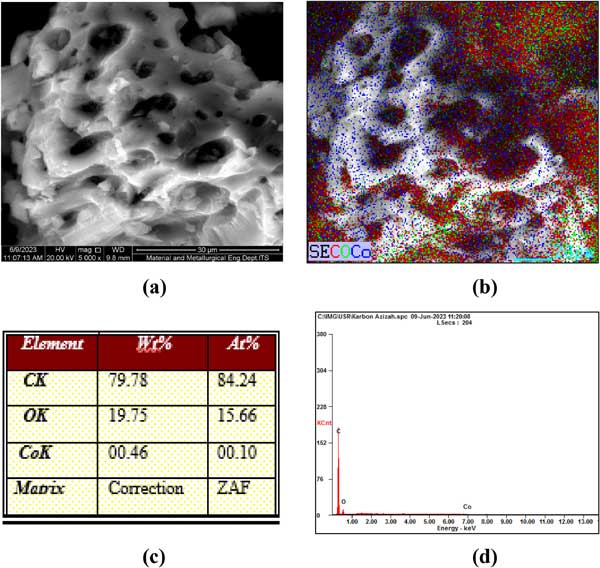 此外,EDX分析結(jié)果表明碳含量高(C=79.78%)和化學結(jié)合氧(O=19.75%),如圖1和2所示。5c和5d。還存在少量鈷(Co=0.46%),它是在碳化過程中出現(xiàn)的并且沒有得到最佳轉(zhuǎn)化,并且樣品洗滌過程也不是最佳的。下圖中,顯示了樣品的元素分布圖,其中碳為紅色,氧為綠色,鈷為藍色,分布均勻,如圖3b所示。這會影響吸附孔隙結(jié)構(gòu)的形成。