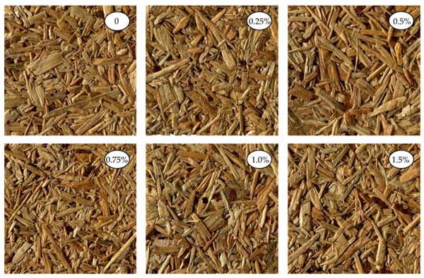 在UF樹脂中添加活性炭還可以改善刨花板的各種機(jī)械性能。研究表明,活性炭可以提高板材的尺寸穩(wěn)定性、強(qiáng)度和防水性。這在擔(dān)心潮濕暴露的應(yīng)用中尤其有益。所生產(chǎn)的刨花板的外觀如圖2所示。添加高達(dá)1.5%活性炭沒有觀察到任何影響。相反,在碳含量較高的情況下,所得板材變暗并變灰。因此,在不影響材料美觀的情況下,這可以被視為較小負(fù)載的優(yōu)勢(shì)。