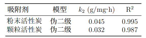 吸附過(guò)程符合偽二級(jí)動(dòng)力學(xué)模型(R2>0.99),表明化學(xué)吸附為主導(dǎo)機(jī)制。吸附速率常數(shù)k2隨粒徑減小而增加,反映了粉末活性炭的快速吸附特性(圖2)。