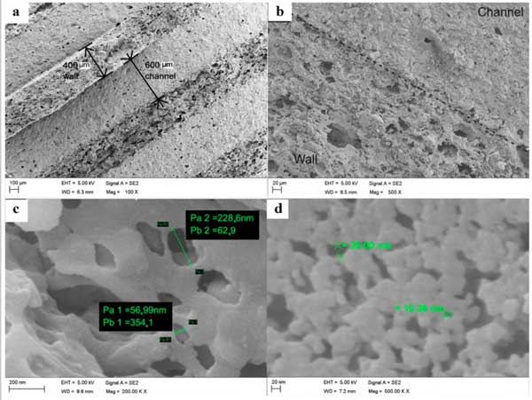 活性炭SEM圖像揭示了材料的孔隙性質(zhì)。圖1a、b中的低放大圖像顯示了具有擠壓(墻)和內(nèi)部(通道)結(jié)構(gòu)差的單體縱向部分的主要形態(tài),其中高放大(圖1c、d)圖像分別顯示了小宏觀和中孔直徑范圍內(nèi)孔內(nèi)部結(jié)構(gòu)的主要形態(tài)。