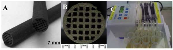 圖2:活性炭整體材料。(A)活性炭的外觀尺寸:長度10厘米,直徑6.9±0.1毫米;(B)截面幾何尺寸:通道數(shù)量32個,邊長0.6毫米;壁直徑0.4毫米;(C)用于活性炭整體材料LPS吸附研究的流動循環(huán)系統(tǒng)。