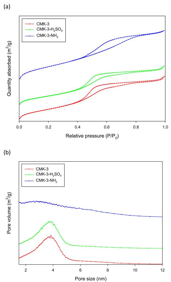 表1列出了本研究中使用的活性炭的物理性質(zhì);钚蕴-3的比表面積為1178m 2 / g。經(jīng)硫酸處理后比表面積略有下降至1,002m 2 / g,經(jīng)氨處理后比表面積大幅度上升至1663m 2 / g。圖2示出了氮氣吸附等溫線和孔碳的孔隙大小分布。圖2a示出了用于活性炭-3,活性炭-3-H的氮吸附等溫線2 SO 4,和活性炭-3-NH 3。所有樣品在0.5 的相對壓力(P / P 0)下都顯示典型的介孔材料的IV型等溫線。表表11表明,CMK-3具有的3.8納米的孔徑中孔。用硫酸處理后維持這些中孔。當活性炭-3用氨處理時,平均孔徑減小到3.1nm。氨處理是高溫(900℃)工藝,其產(chǎn)生微孔,引起表面積的大量增加和平均孔徑的減小。另一方面,大部分介孔活性炭-3在氨處理后保持。