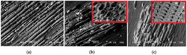 圖中顯示了活性炭和對(duì)比材料的SEM背散射電子圖像(BSI)?梢钥闯,活性炭其表面上具有排列良好的孔隙。然而,由于高分子量揮發(fā)物的釋放,鋸末的纖維結(jié)構(gòu)在熱解后被改變,這影響了孔的數(shù)量和直徑,觀察到尺寸為9-16μm的較小的孔和尺寸為21-48μm的較大的孔。這也表明,形成了幾個(gè)良好的方向微孔與尖銳和彎曲的邊緣形成。孔隙率增加,由于脂族C結(jié)構(gòu)與芳族C結(jié)構(gòu)變換。