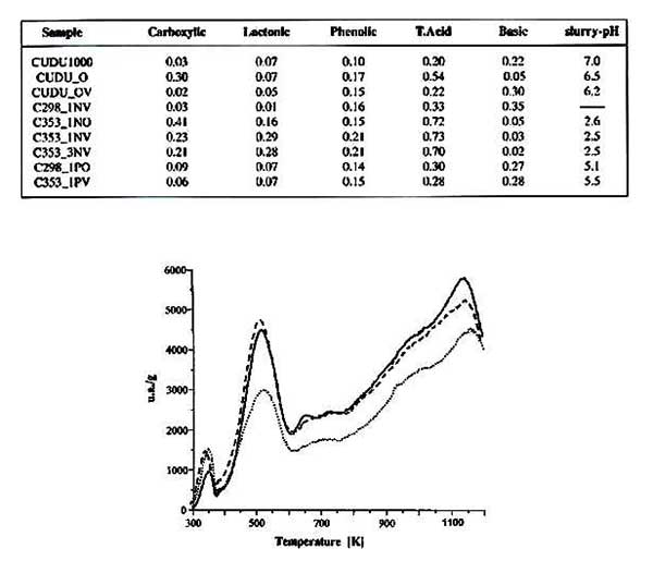 圖1顯示了過氧化氫處理后產(chǎn)生的活性炭的化學(xué)行為。從上面看出的氧化過程增加了活性炭的總酸度,并且與羧基和酚類基團(tuán)的增加一致。此外,TPD曲線顯示了放出氣體的增量,峰值集中在與活性炭相同的溫度。低溫和高溫分解組的面積總體增加歸因于羧基-內(nèi)酯類結(jié)構(gòu)和后面的酚類基團(tuán)。H2O2氧化碳的FT-IR光譜在1542和1190cm-1處顯示帶就像那些原始的碳,但后來的孔隙已經(jīng)擴(kuò)大,顯示出C-O伸展模式的增加?傊,這些研究表明僅在H的性質(zhì)的小變化H2O2處理過的碳,即,是在氧化時,其類似于由其他研究人員報告的行為沒有觀察到變化顯著。其中過氧化氫溶液的氧化作用明顯地看作羧酸類基團(tuán)的重要減少,伴隨著堿性基團(tuán)的大量增加。