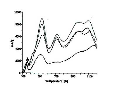 分析表明25℃下的反應(yīng)只產(chǎn)生很小的變化,所以在低溫下HNO 3溶液主要以酸的形式反應(yīng),只對活性炭產(chǎn)生微小的改變。然而,在80℃下的活性炭反應(yīng)顯示與HNO 3的氧化作用有關(guān)的主要變化,如活性炭中總表面基團(tuán)的總體增加和羧基類似基團(tuán)的最大形成。另外,由樣品的堿度降低可以解釋為6M硝酸溶液處理3小時后堿性基團(tuán)的延長氧化的結(jié)果。圖2顯示了這些活性炭的TPD曲線,觀察到新峰的存在,給出了碳的化學(xué)組成的變化,即氧化基團(tuán)的增量。硝酸改性碳的元素分析表明,由其他人觀察到,增加氮含量可以歸因于硝基(NO 2)形成的影響。