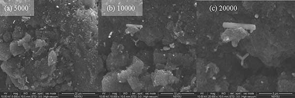 硫浸漬活性炭由大量微孔組成,高硫含量增強(qiáng)了活性炭對氯化汞的吸附能力。微孔通常具有大部分HgCl2吸附的活性位點(diǎn),而大孔和中孔作為運(yùn)輸路線。圖21顯示了分別放大5000,10,000和20,000倍的硫浸漬活性炭的ESEM圖像。如圖1所示,主要在活性炭表面發(fā)現(xiàn)大于500的大孔,中孔和微孔隱藏在活性炭內(nèi)部。在硫浸漬之后,硫分子可以擴(kuò)散并沉積在活性炭的微孔上,并且可能堵塞過渡路徑。