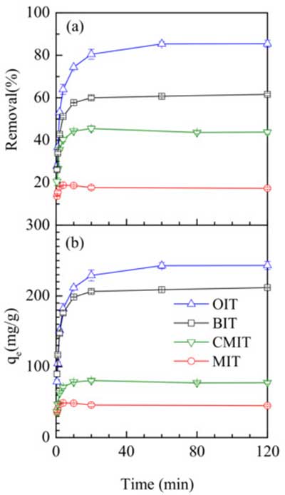圖1.吸附時(shí)間對去除異噻唑酮(a)和吸附量(b)在活性炭劑量為100mg·L-1時(shí)在溫度25℃的影響。