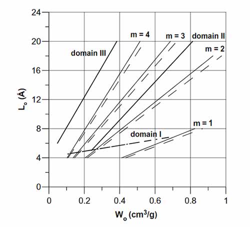 活性炭孔隙率遵循三個線性結(jié)構(gòu)域所示的常見趨勢。這一事實表明存在著由不同前體和精制路線的固體部分共同形成的共同形態(tài)。根據(jù)這些多孔固體的近期和各種已發(fā)表的特征,它們的孔壁由基本結(jié)構(gòu)單元的空間排列構(gòu)成,所述基本結(jié)構(gòu)單元由層疊的石墨烯層組成。為了減少模型中的參數(shù)數(shù)量,結(jié)構(gòu)被描述為圓盤狀顆粒,其直徑的特征在于石墨烯層中涉及的苯環(huán)的數(shù)量,并且其厚度由堆疊層的數(shù)量和層間距離。用于工業(yè)宏觀尺寸盤狀顆粒堆積的可用經(jīng)驗相關(guān)性已經(jīng)應用于那些納米級結(jié)構(gòu),導致在chars和碳分子篩觀察到的實驗微孔體積范圍內(nèi)的值。