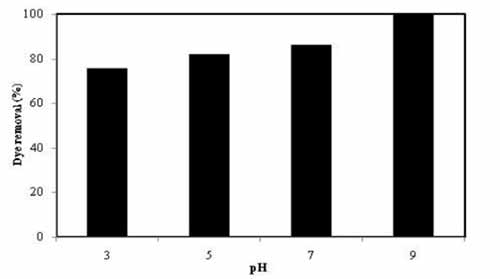 圖2:pH對活性炭吸附甲基紫的影響(條件:初始濃度=100mg L-1,接觸時(shí)間=120 min,活性炭劑量=0.6g L-1)。