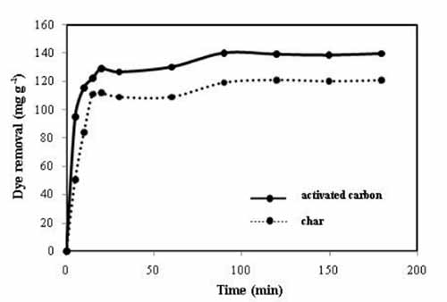 圖3:接觸時(shí)間對活性炭吸附甲基紫的影響(條件:初始濃度=100mg L-1,pH=9,活性炭劑量=0.6g L-1)。