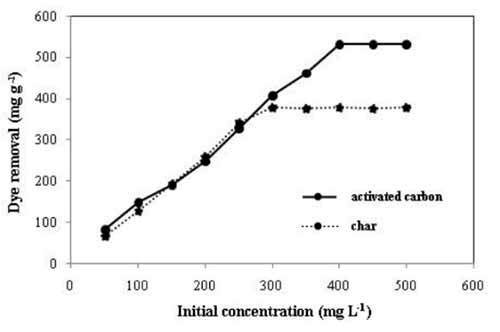 圖4:初始濃度對活性炭吸附甲基紫影響(條件:pH=9,接觸時(shí)間=90分鐘,活性炭劑量=0.6g L-1)。