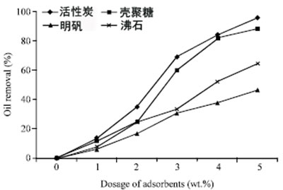 通過改變吸附劑的重量,以100rpm的混合速率,1小時,分析不同吸附劑用量(wt。%)對活性炭與沸石相比對MEA去除殘留油的影響;旌蠒r間,在25-30℃的溫度下接觸時間為1小時。測試在樣品的原始pH下進行,即11.21。在CO 2去除單元系統(tǒng)中根據(jù)需要維持pH水平。圖1顯示了使用活性炭和沸石從MEA廢水中去除殘留油的百分比。從圖1中可以看出觀察到,在最高吸附劑用量(5重量%)下,活性炭與其他物質(zhì)相比顯示出最高的殘油去除率;钚蕴砍晒Τ87%的殘油,沸石為46%?梢缘贸鼋Y(jié)論,活性炭最好比其他吸附劑更好地除去殘油。