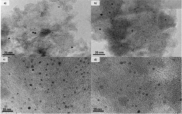 所有活性炭催化劑都顯示出高BET表面積。在二氯甲烷加氫脫氯中使用后沒(méi)有觀察到顯著差異,這消除了碳質(zhì)沉積物阻塞多孔結(jié)構(gòu)作為催化劑失活的原因。CO化學(xué)吸附結(jié)果表明,鉑在所有活性炭催化劑中均勻分散,它們之間略有不同。高Pt分散可歸因于活性炭的高表面積及其表面化學(xué)性質(zhì),這在催化劑制備過(guò)程中引起活性相與載體之間的相互作用。TEM圖像(圖1)和金屬粒度分布(圖2)證實(shí)了在鉑在兩種不同活性炭中形成Pt納米顆粒,平均尺寸值分別為1.6和2.0nm。