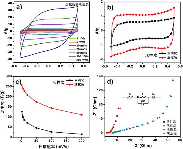 在不同掃描速率下觀察到兩種活性炭的準(zhǔn)矩形CV曲線(圖3a),這暗示了非理想的電容行為。我們還觀察到活化后的活性炭的CV環(huán)路較大,這意味著它具有比未活化的活性炭更大的電容(圖3b)。具體電容的總結(jié)如圖3c所示,活化后活性炭獲得的高電容為270,而沒活化的活性炭為125。這種高電容可歸因于諸如高表面積,分級孔徑分布和活性炭的表面潤濕性等因素。對于兩種活性炭,由于電解質(zhì)不足以擴散到電極材料的內(nèi)孔中而觀察到對應(yīng)于掃描速率增加的比電容的降低。