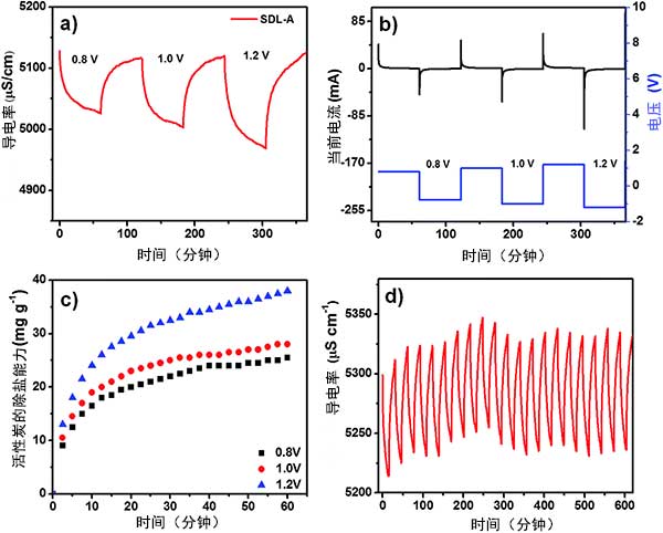 在充電步驟期間,在兩個電極上向膜電容去離子施加正電勢,以從已知NaCl濃度的溶液中吸附離子,并施加負電位以使電極放電并排出廢物流中的離子。圖4a顯示了在NaCl溶液中0.8V至1.2V的各種電位下,活性炭在初始濃度2500mg L-1下的脫鹽性能。在所有施加的電位中,在充電期間首先觀察到溶液電導(dǎo)率的急劇下降,并且當(dāng)吸附接近平衡時,電導(dǎo)率的變化減小直至達到平臺。圖4b示出了具有增加電勢的正相關(guān)電流瞬變,而圖4c顯示了活性炭電極在不同施加電位下的鹽吸附容量。從0.8V到1.2V,鹽吸附容量從23增加到38mg g-1,表明更高的電池電位可以提高電吸附能力。觀察到的現(xiàn)象可歸因于強靜電力的存在以及在增加的電壓下形成較厚的雙電層。圖4d示出了活性炭電極的循環(huán)穩(wěn)定性,在2500mg L-1的NaCl溶液超過20次充放電循環(huán)而沒有去除能力任何明顯的損失。該結(jié)果證實了使用活性炭當(dāng)電極可以再生和重復(fù)使用而沒有任何損耗,活性炭是成為用于膜電容去離子應(yīng)用的電極材料的好材料。